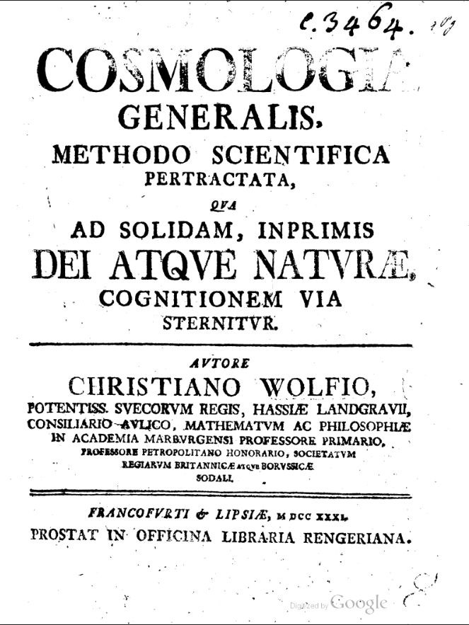 Cosmologia generalis, methodo scientifica pertractata, qua ad solidam, inprimis dei atque naturae, cognitionem via sternitur