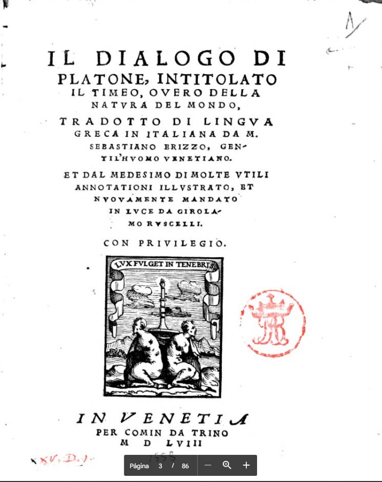 Il dialogo di Platone intitolato il Timeo, overo della natura del mondo. Tradotto di lingua greca in Italiana da M. Sebastiano Erizzo gentil’huomo veneziano. Et dal medesimo di molte utili annotationi illustrato, et nuovamente mandato in luce