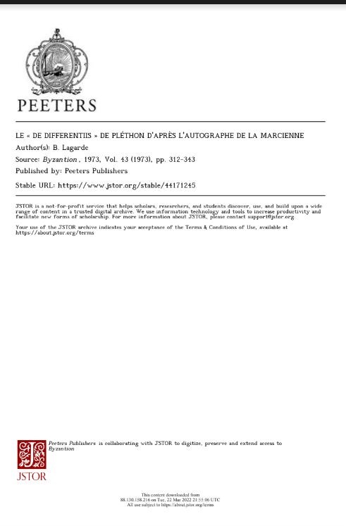 Le ‘de differentiis’ de Pléthon d’après l’autographe de la Marcienne