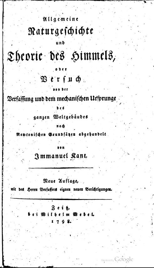 Allgemeine Naturgeschichte und Theorie des Himmels, oder Versuch von der Verfassung und dem mechanischen Ursprunge des ganzen Weltgebäudes nach Newtonischen Grundsätzen abgehandelt