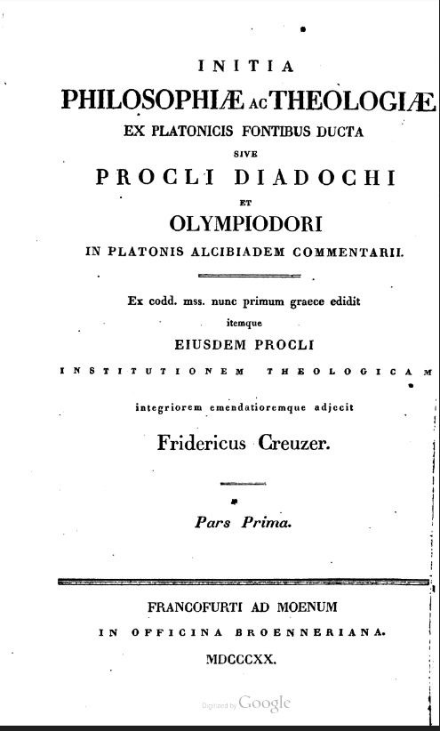 Initia Philosophiæ Ac Theologiæ Ex Platonicis Fontibus Ducta Sive Procli Diadochi Et Olympiodori In Platonis Alcibiadem Commentarii / Ex codd. mss. nunc primum graece edidit itemque Eiusdem Procli Institutionem Theologicam integriorem emendatioremque adje
