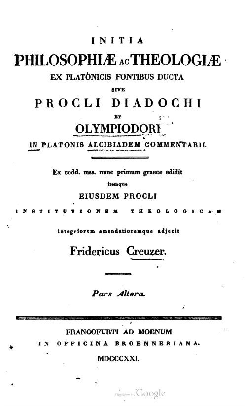 Initia Philosophiæ Ac Theologiæ Ex Platonicis Fontibus Ducta Sive Procli Diadochi Et Olympiodori In Platonis Alcibiadem Commentarii / Ex codd. mss. nunc primum graece edidit itemque Eiusdem Procli Institutionem Theologicam integriorem emendatioremque adje