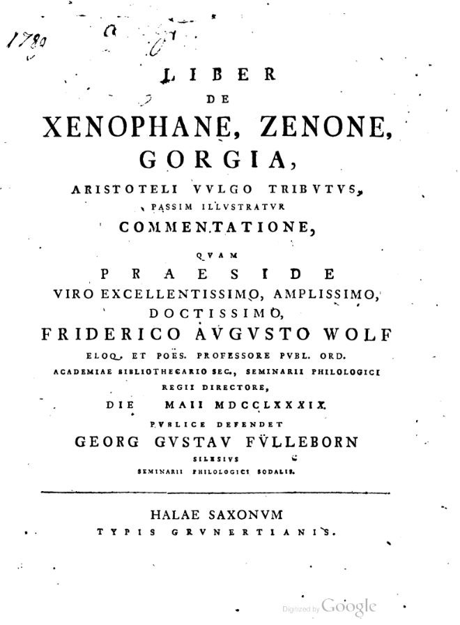 Liber De Xenophane, Zenone, Gorgia, Aristoteli Vulgo Tributus, Passim Illustratur Commentatione : Quam Praeside Viro Excellentissimo, Amplissimo, Doctissimo, Friderico Augusto Wolf Eloq. Et Poes. Professore Publ. Ord. Academiae Bibliothecario Sec., Semin