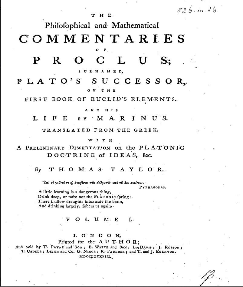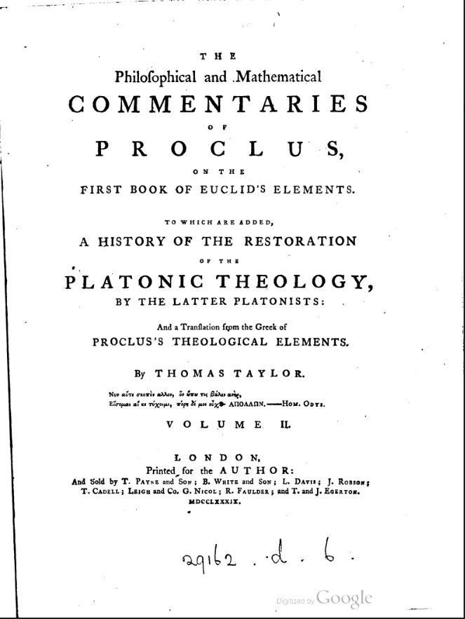 The Philosophical and Mathematical Commentaries of Proclus, on the First Book of Euclid’s Elements. To Which Are Added, a History of the Restoration of the Platonic Theology, by the Latter Platonists: and a Translation from the Greek of Proclus’s Theologi
