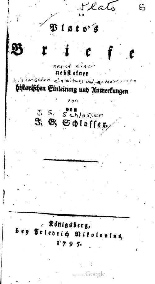 Plato’s Briefe, nebst einer historischen Einleitung und Anmerkungen von J.G. Schlosser