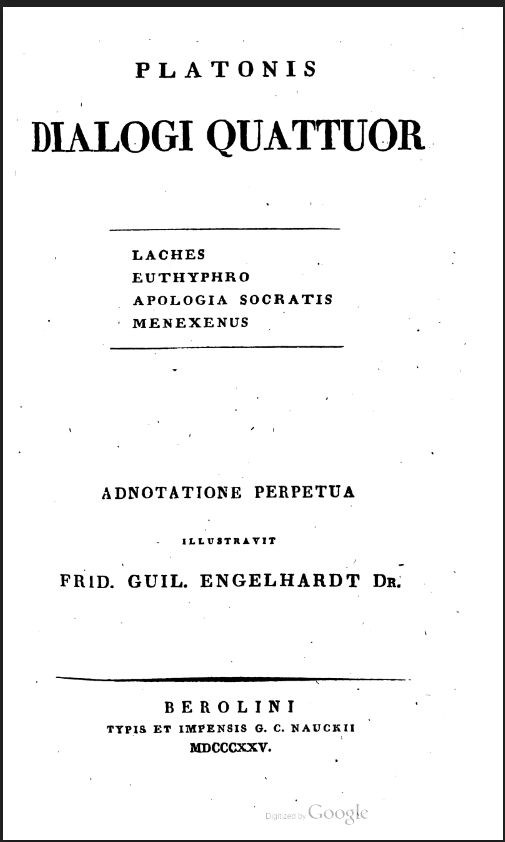 Platonis dialogi quattuor. Laches, Euthyphro, Apologia Socratis, Menexenus. Adnotatione perpetua illustravit Frid. Guil. Engelhardt