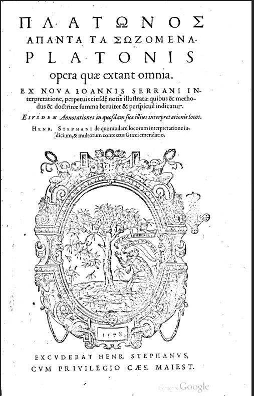 Platōnos hapanta ta sōzomena. Platonis opera quae extant omnia, ex nova Ioannis Serrani interpretatione, perpetuis eius de notis illustrata: quibus et methodus et doctrinae summa breuiter et perspicue indicatur. Eiusdem Annotationes in quosdam sua illiu