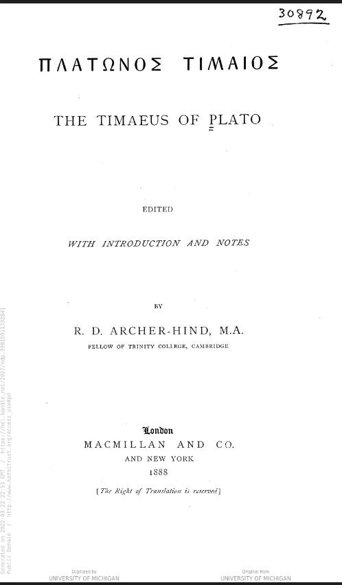 Platōnos Timaios: The Timaeus of Plato, edited with introduction and notes