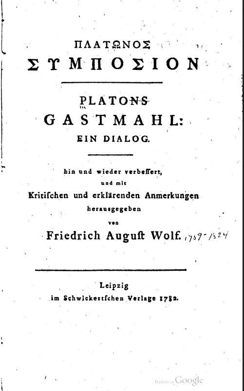 Platōnos Symposion, hin und wieder verbessert, und mit Kritischen und erklärenden Anmerkungen herausgegeben von Friedrich August Wolf