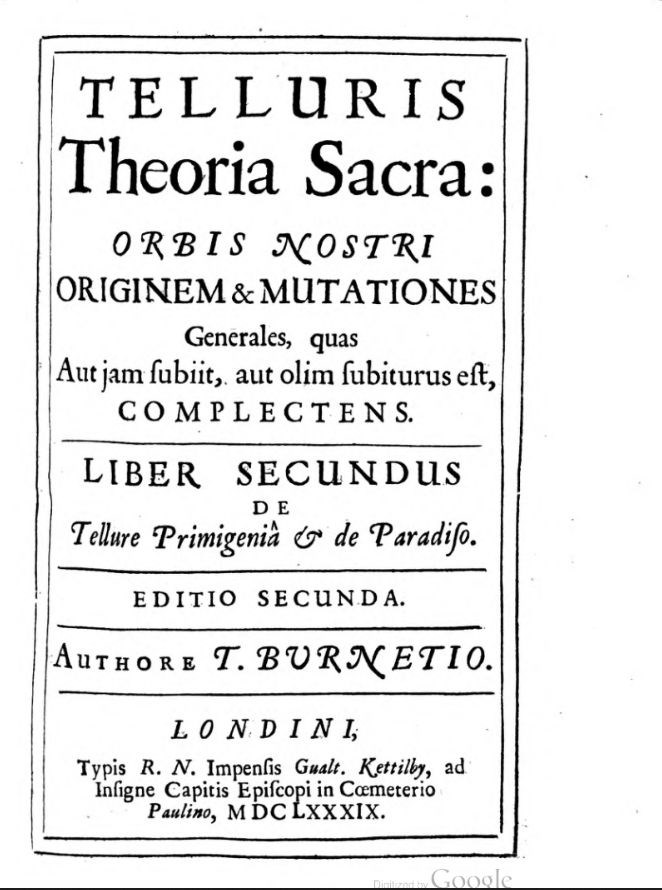 Telluris theoria sacra: orbis nostri originem & mutationes generales, quas aut jam subiit, aut olim subiturus est, complectens. Liber secundus de tellure primigenia et de paradiso