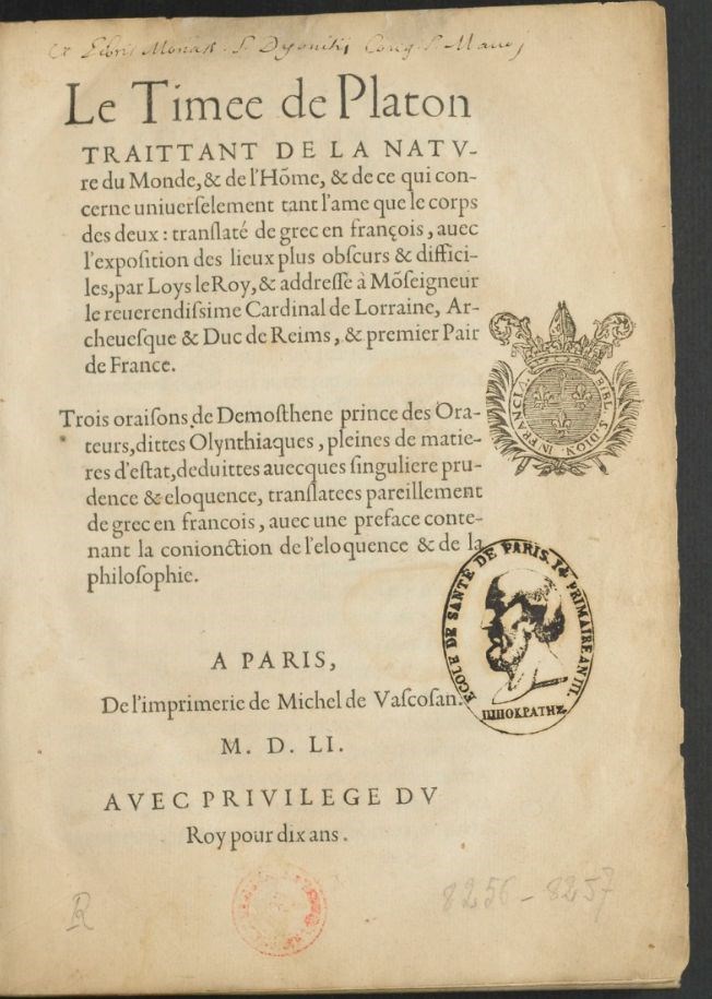 Le Timee de Platon traittant de la nature du monde, & de l’home, & de ce qui concerne universelement tant l’ame que le corps des deux