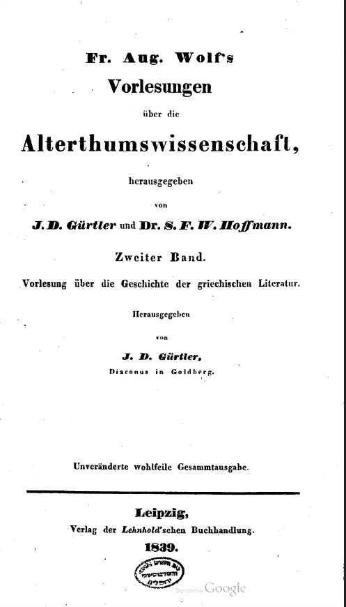 Vorlesungen über die Althertumswissenschaft. Bd. 2. Vorlesungen über die Geschichte der Griechischen Litteratur.