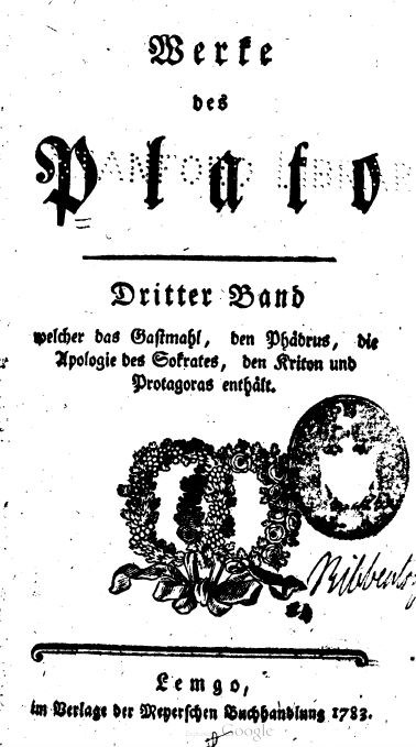 Werke des Plato. Band 3: welcher das Gastmahl, den Phädrus, die Apologie des Sokrates, den Kriton und Protagoras enthält