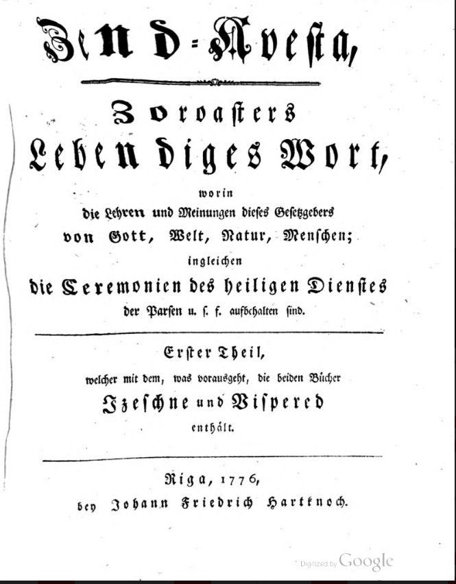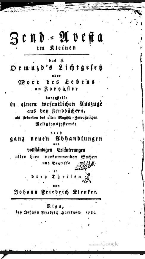 Zend-Avesta im Kleinen: das ist Ormuzd’s Lichtgesetz oder Wort des Lebens an Zoroaster dargestellt in einem wesentlichen Auszuge aus den Zendbüchern [...] nebst ganz neuen Abhandlungen u. vollst. Erläuterungen aller hier vorkommenden Sachen u. Begriffe in